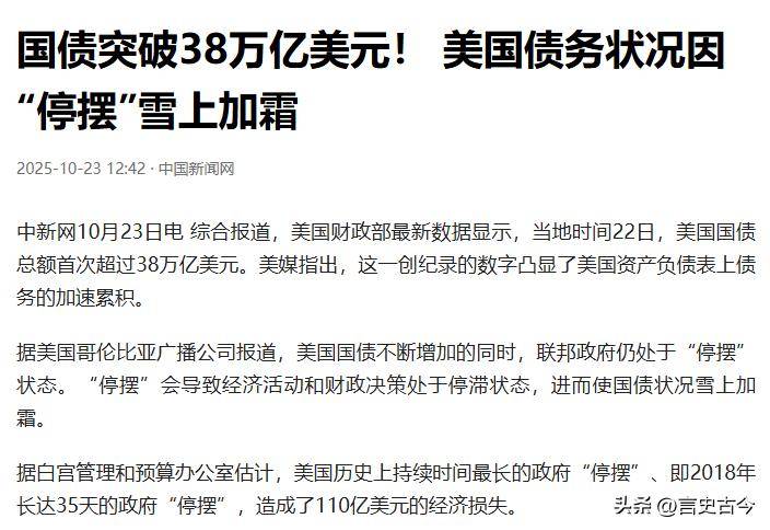 美国国债已经飙升到38万亿美元,这意味着每个美国人,哪怕是刚出生的婴儿,身上都背着十万美元的债。