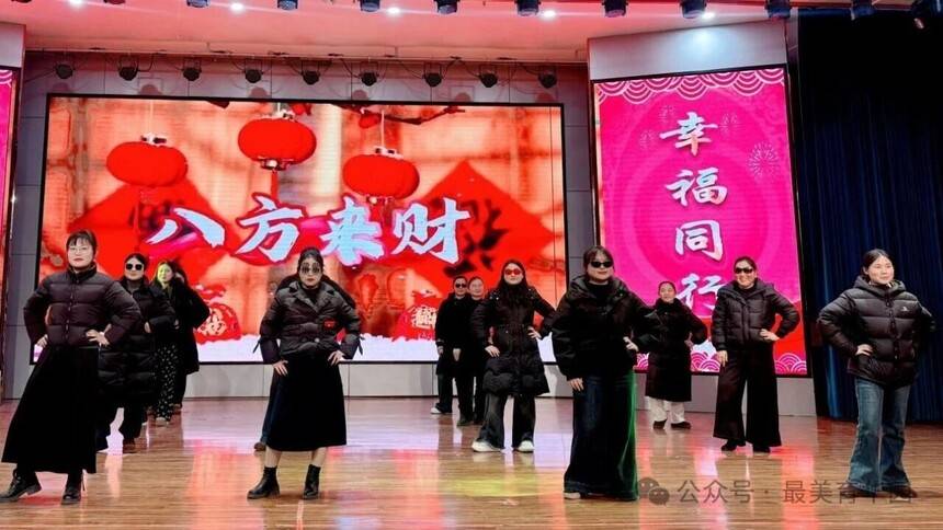 节目精彩纷呈,令人赏心悦目。四年级的教师们用开场舞《八方來财》率先登场,用动感十足的舞步点燃全场,欢快的节奏里满是对新年的美好期许;五年级教师团队用歌声《最炫教师风》唱出了育华园教师的自信与风采,每一句歌词都饱含着对教育事业的热爱;七年级的教师们化身“主播”,用幽默诙谐的表演再现了校园里的趣味日常,引得全场笑声不断;八年级教师团队以优美的歌声与灵动的舞姿,传递出对学校发展、师生成长的美好祝愿。