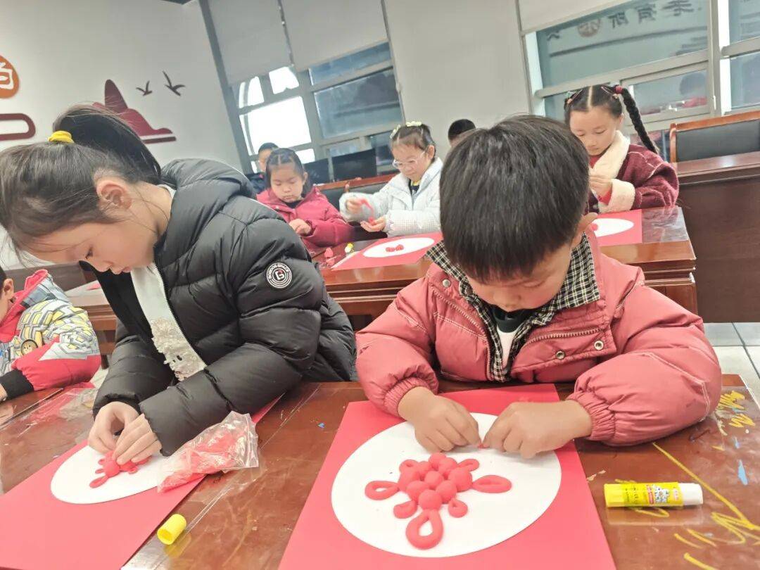 活动现场气氛热烈,充满欢声笑语。孩子们了解了中国结所蕴含的团圆、吉祥、平安的美好寓意。随后,大家兴致勃勃地投入到粘土创作中。他们充分发挥想象力,用一双双灵巧的小手,将粘土搓成一个个匀称圆润的泥球,再精心组合、拼贴,巧妙地将这些基础形状构造成一幅幅充满童趣的“中国结”图案。这些作品虽略显稚嫩,但色彩鲜艳、构思独特,每一件都凝聚着孩子们对传统技艺的理解和对新年的真挚祝福。
