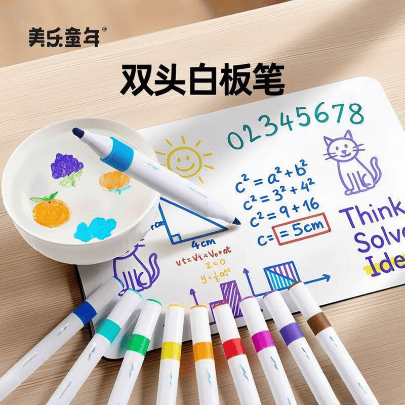 美乐童年白板笔的双头设计增加了使用灵活性,一端适合书写,另一端则更适合涂鸦,广泛适用于白板、黑板等多种书写表面。这样的创新极大提升了孩子们在不同场景下的实用性,使得在家庭或学校的学习互动更加便捷且富有趣味。